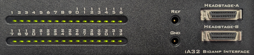 The iA32 has two 26-pin headstage connectors (analog) on the front of the unit. The connectors are labeled alphabetically from top to bottom. Each connector carries signal for one bank of channels with ground and reference. The corresponding channel numbers depend on the reference mode configuration.
