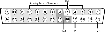 There are 8 (+) channels and 8 (-) channels per DB26 connector. Subsequent banks are indexed by an additional 8 channels.