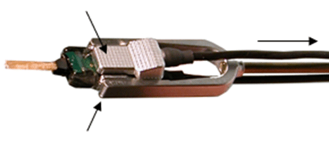 The lock pin prevents the clip from opening and releasing the probe, and also from sliding backward during insertion.