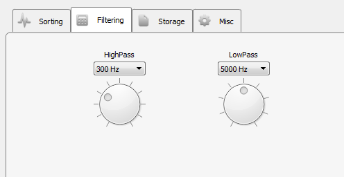 The gizmo applies a highpass and lowpass filter to all channels before spike detection. The runtime interface includes controls for dynamic adjustments to the filter settings. You also set default values in the Filtering tab.