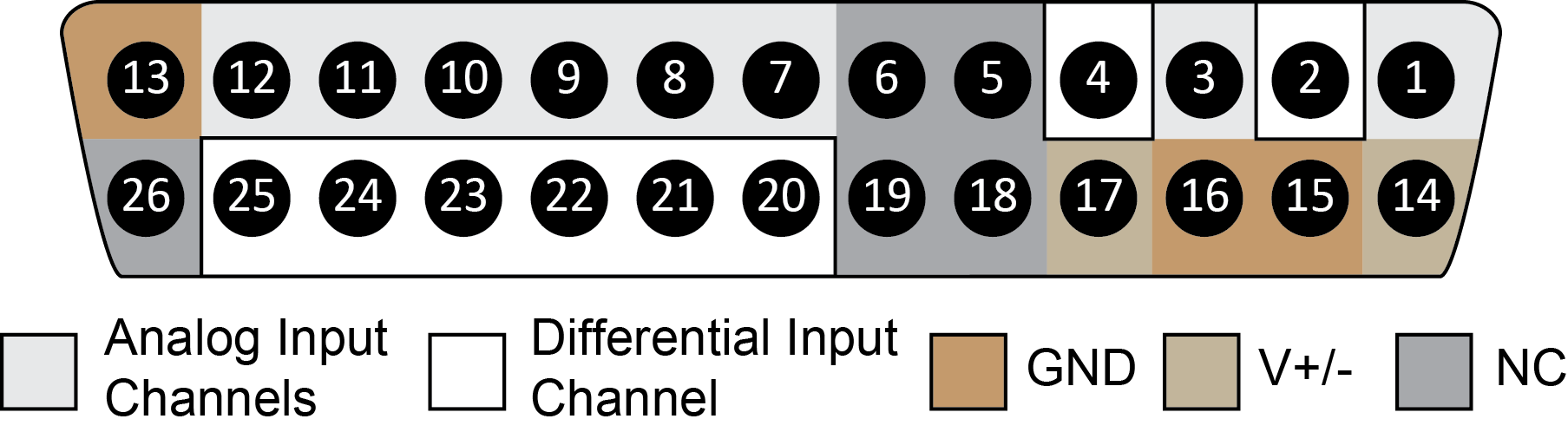 There are 8 (+) channels and 8 (-) channels per DB26 connector.