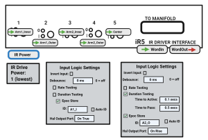 The iRn (iR5, iR10) modules provide a simple way to detect animal placement in real time. The power comes from an IR LED and detector pair, controlled through the iRn, which users place across the region of interest. An event is triggered when a beam break is detected.