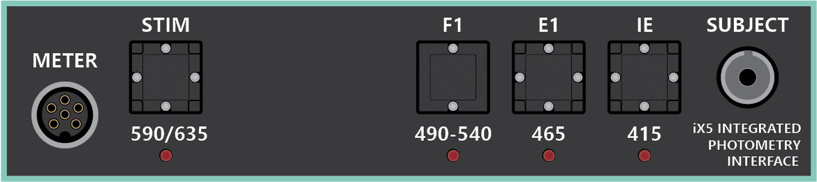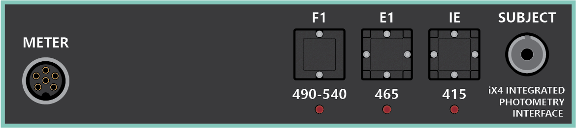 Integrated LEDs and photosensors provide more powerful light delivery and larger return signals compared to external optical routing schemes. The iX7 has a built-in power meter port for easy cable testing and an integrated red LED for simultaneous photometry + optogenetic stimulation.